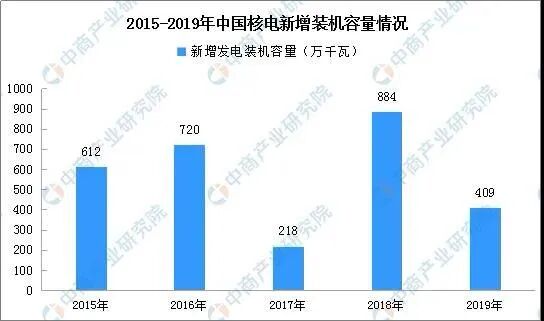 新增装机量方面,2018年是我国核电装机大幅新增的一年,新投产7台核电机组,包括阳江核电5号机组、三门核电1号机组、台山核电1号机组、三门核电2号机组、田湾核电3机组、田湾核电4号机组以及海阳核电1号机组,新增装机容量884万千瓦。此外,AP1000和EPR全球首堆建成投产。2019年虽有回落,核电新增装机量仍达409万千瓦。