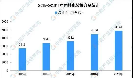 从核电装机容量来看,近年来保持向好的趋势,2018年核电装机量突破4000万千瓦。数据显示,截至2019年我国核电装机容量达到4874万千瓦,同比增长9.14%。2013-2019年,中国核电装机容量复合增长率22.17%。