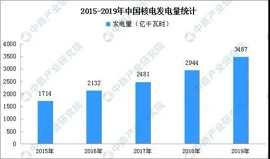 随着我国核电项目陆续完工投产,核电应用进一步推广,我国核电发电量保持增长的趋势。截至2019年,我国核电发电量达到3487亿千瓦时,同比增长18.4%。值得注意的是,虽然发电量持续增长,但核电在整个发电总量中的占比仍然较低,仅约为4%的比重,距离全球平均水平仍有差距。