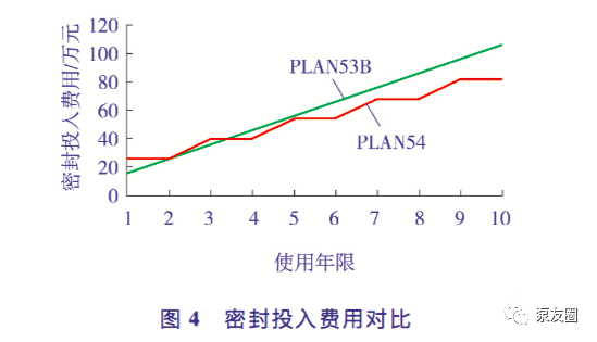 由图4可以看出:PLAN53B在前3年具有优势,但随着使用时间的延长,PLAN54密封寿命长的优点逐渐明显,第4年之后,PLAN54在使用成本上要更胜一筹。以上数据只是参考目前行业平均水平,无法做到精确。不同泵的有不同的工况,不能一概而论。