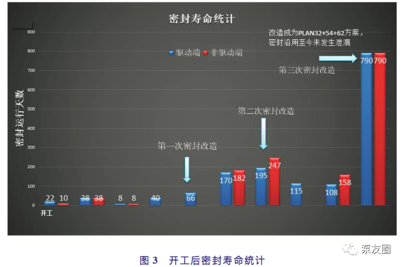 经过前后2次改造,不断摸索经验,最终形成PLAN32+PLAN54+PLAN62创新型组合。从2016年9月B泵改造至2018年11月,密封运行正常,平均寿命由最初的几天到现在的790d,超出同行业平均寿命约430d,这也证明此次改造是比较成功的。开工后密封寿命统计见图3。