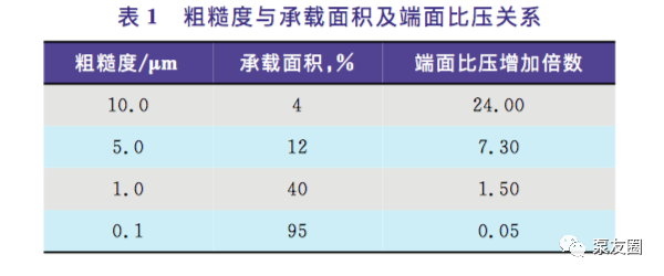停泵时的数据显示,泵入口流量低于设计值,说明当时泵处于憋压状态,密封腔压力升高。这是导致渣油窜入密封油箱的主要原因。渣油密度大,粘度大,易在密封面附着、结焦,导致密封面粗糙度被破坏,正常要求密封面粗糙度不超过0.9μm,承载面变化从而影响到端面比压,最终造成动静环磨损,局部的高温甚至导致裂纹产生,不同粗糙度承载面积和端面比压的关系见表1。