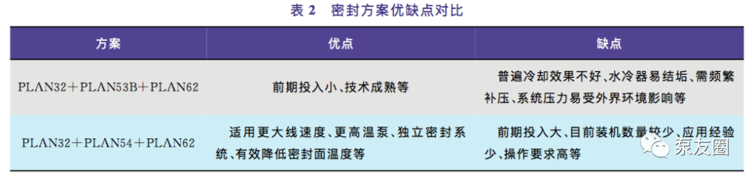 目前国内渣油加氢装置同位置密封通常采用PLAN32+PLAN53B+PLAN62,也是比较成熟的技术。2种密封方案的优缺点对比情况见表2。